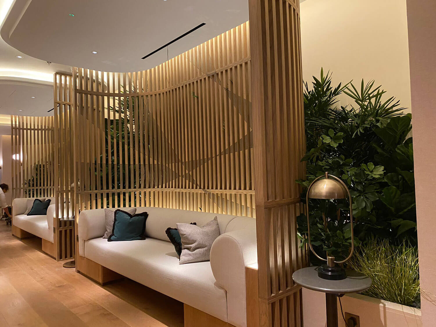 The main challenge was location, being two to three floors below ground level meant absolutely no natural light for real plants to survive. Yet, they desperately wanted to soften these elegant spaces and create that luscious, living feeling that makes a luxury spa truly special. The spa reception featured gorgeous built-in banquette seating with beautiful gapped battened backing, but behind it sat an obvious void that simply looked like empty, wasted space rather than the sophisticated backdrop such seating deserved.