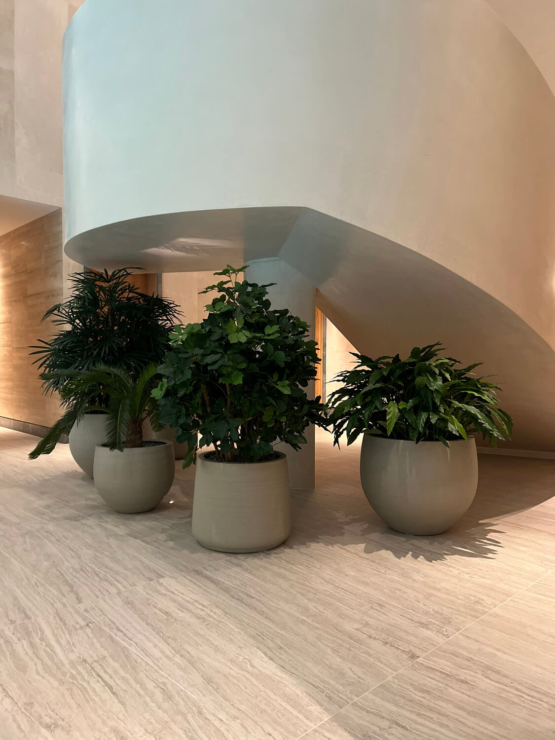 Underneath the pool area's spiral staircase, we curated an artful collection of planters in varying shapes and styles, filled with luscious tropical plants, towering palms, flowing philodendrons, and striking calatheas. We kept the height manageable so nothing interfered with the stairs, but made them wonderfully wide and full to gently guide guests away from the stair edges without creating any sense of barrier. The result looked both elegant and effortless.