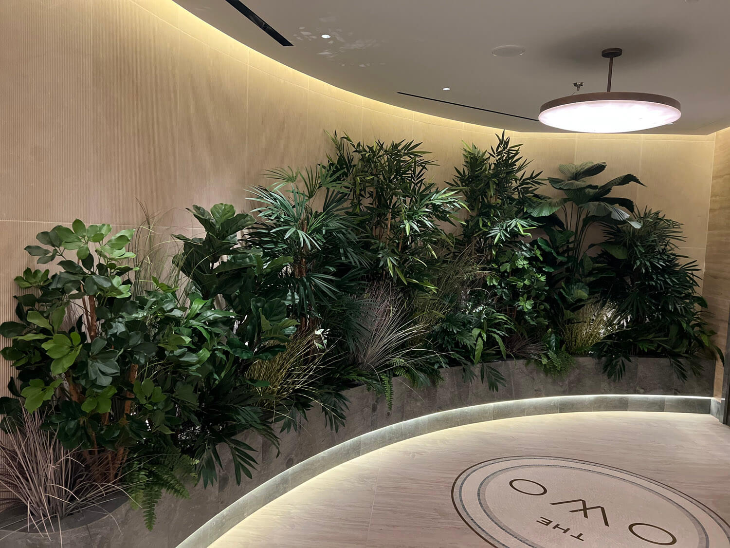 After discussing the vision, we worked through their requirements, including filling and top dressing to be fire retardant. We were delighted to offer a wonderful range of FR plants that have become increasingly sophisticated and varied over the years. We talked through creating different looks and feels across the various areas, we didn't want everything to be too "matchy-matchy", but rather to feel beautifully complementary throughout the space. For the reception's built-in seating with those wooden slatted battens, we styled a gorgeous selection of tropical palms and broad-leafed trees to sit gracefully behind them. This created a stunning vista of shadows and lush greenery visible from every angle, absolutely beautiful.