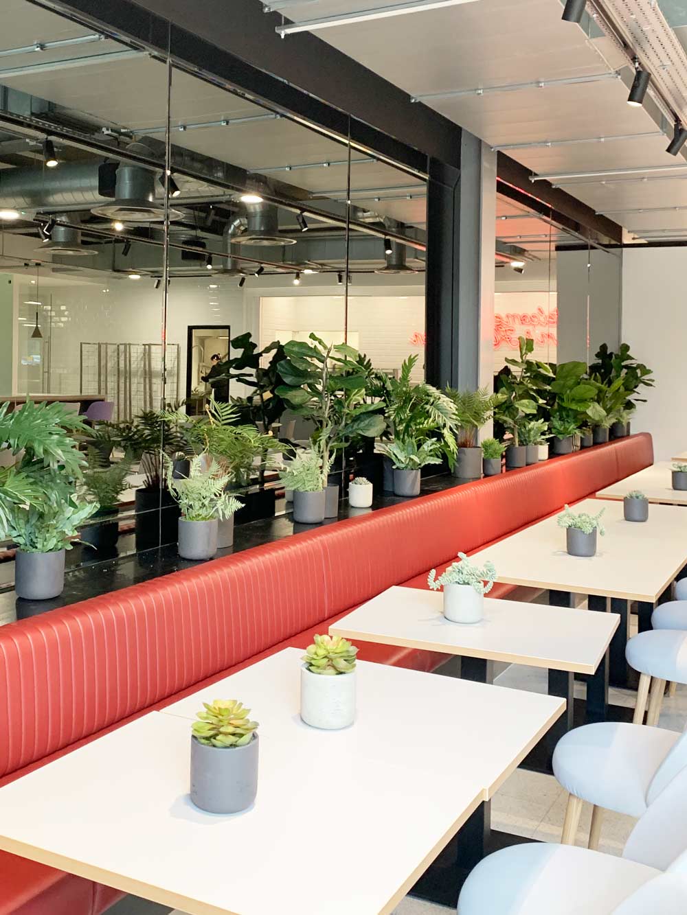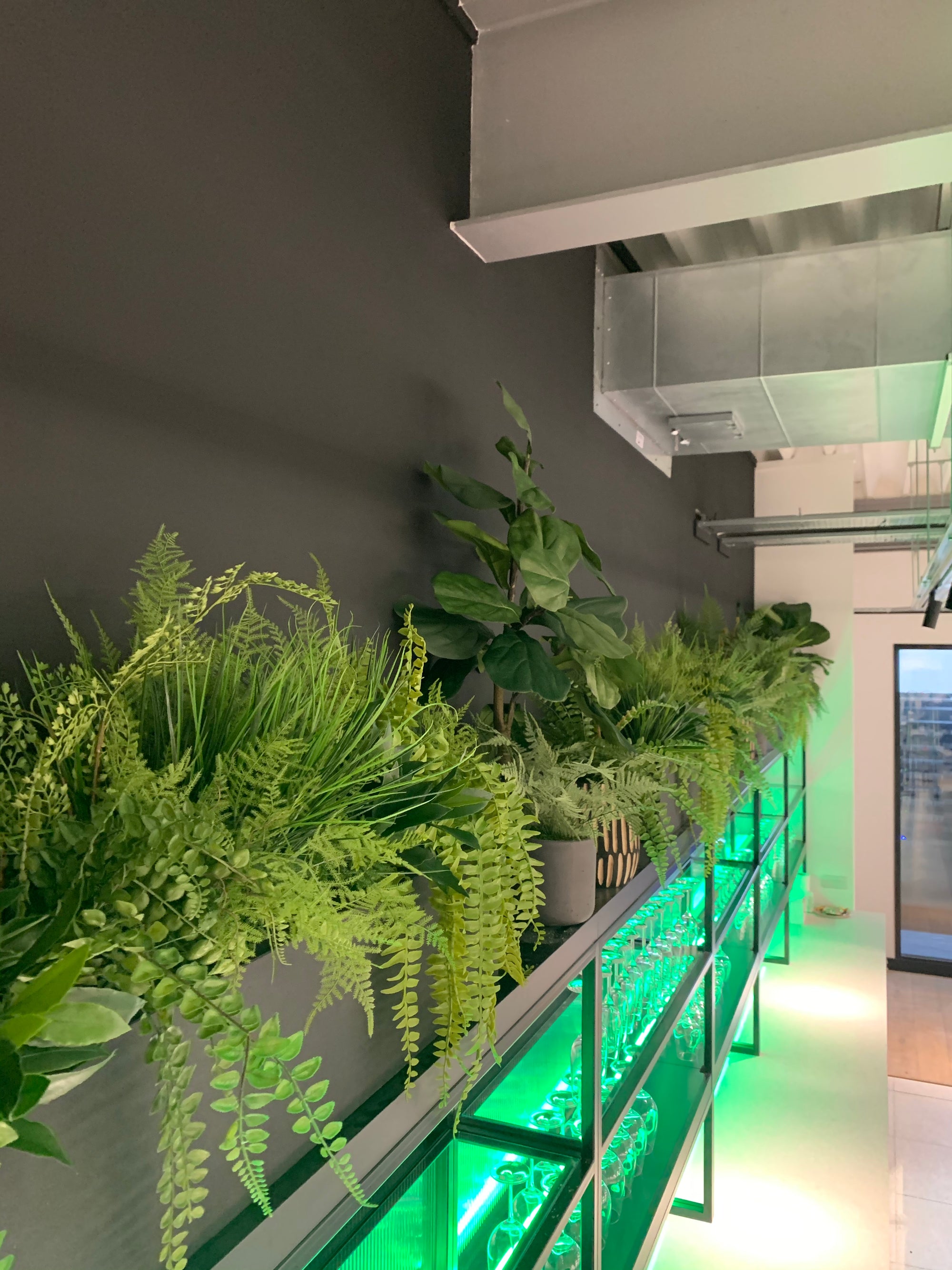 We spent time in the office understanding how people moved through and used the space, observing the sight lines from different desk positions and discussing with our client exactly how they envisioned staff feeling when they looked up from their work. We created bespoke planters that perfectly matched the existing paintwork, ensuring they felt integrated rather than like an obvious addition. These custom-designed plant trays were strategically positioned along the cloakroom's flat surface to maximize visual impact from every angle.